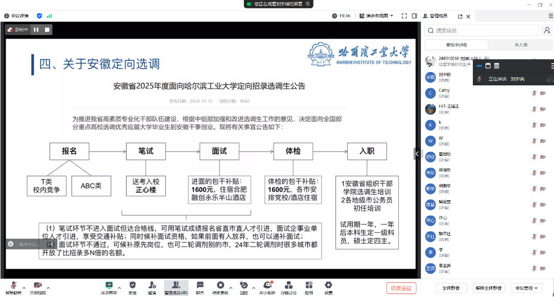 会上,刘宇琪同学首先分享了选调生的备考过程、学习经验及应试技巧,并深入剖析了自己选择选调岗位的心路历程与职业规划,为同学们描绘了选调生的发展蓝图,助力他们明确个人职业方向。针对安徽定向选调,她从岗位选择、选拔流程、工作生活状态等方面进行了详细介绍,为有意报考安徽选调的同学提供了宝贵信息。刘宇琪同学还鼓励大家保持乐观心态,强调每种职业选择的价值在于个人的生活方式与态度,为迷茫中的同学指明了方向。随后,洪浩东同学着重讲解了选调备考的具体策略,包括备考时间安排、科目教材选用、线上课程推荐等,为同学们构建了系统的备考框架。结合个人经历,他强调了政务实习的重要性,认为这不仅能深入了解政府工作流程,还能拓宽视野,鼓励有志于公务员职业的同学积极参与。针对江西省选调,洪浩东从准备事项、岗位分配及工作生活体验等方面分享了个人见解,并劝勉同学们调整心态,冷静备考。