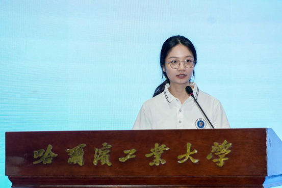 香港理工大学博士研究生聂嘉琳作为员工代表在开幕式上发言。她表达了对参与本届暑期公司的期待,并号召同学们在这个平台上勇敢探索、积极交流、共同成长。